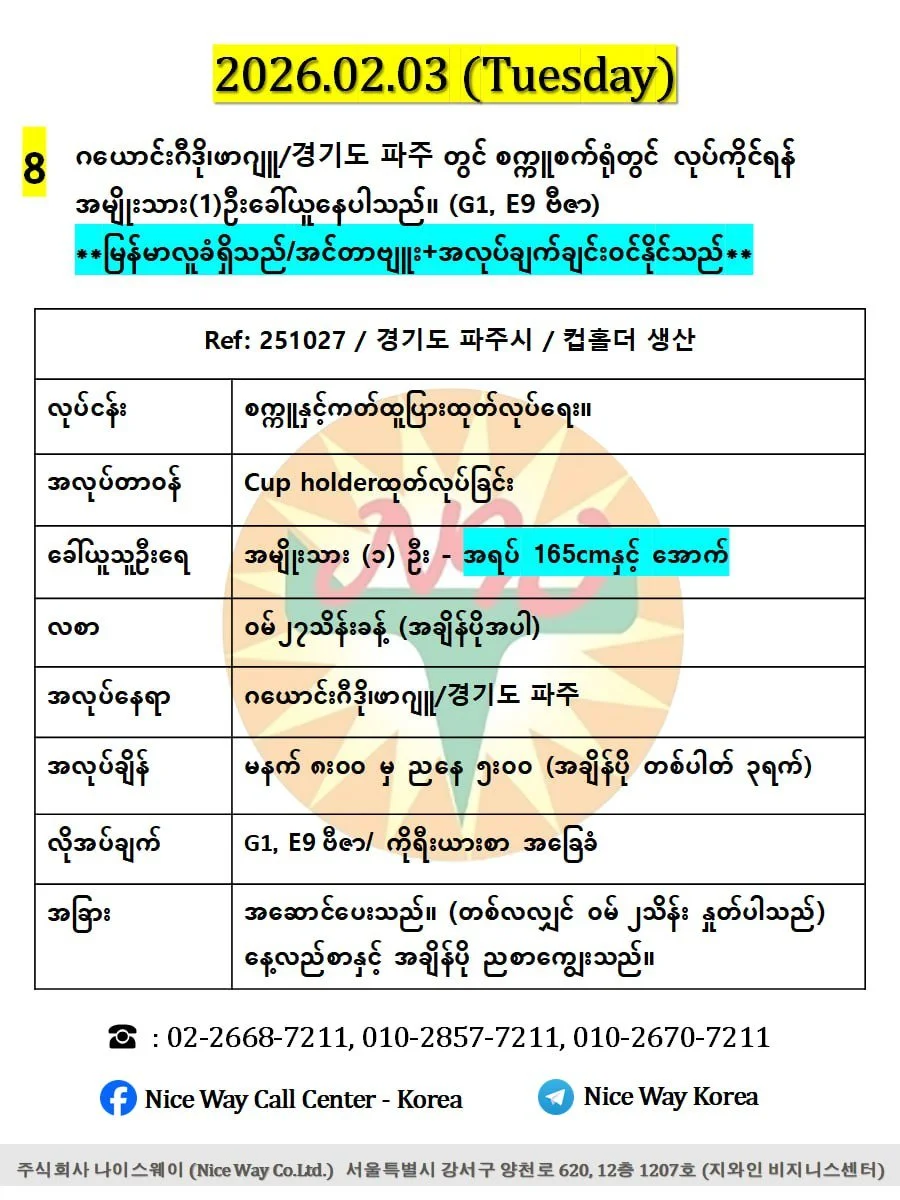 ဂယောင်းဂီဒို၊ဖာဂျူ/경기도 파주 တွင် စက္ကူစက်ရုံတွင် လုပ်ကိုင်ရန် အမျိုးသား(1)ဦးခေါ်ယူနေပါသည်။ (G1, E9 ဗီဇာ)