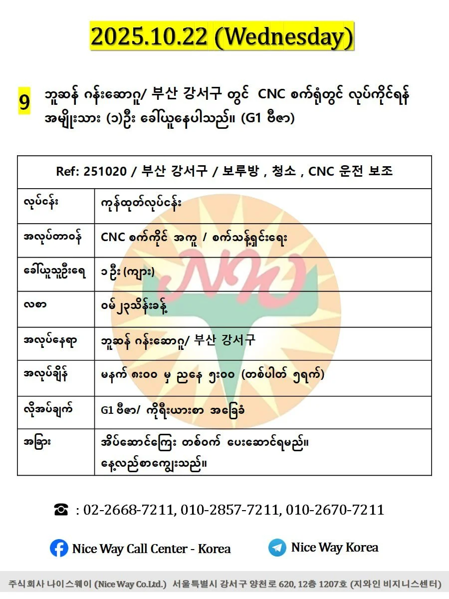 ဘူဆန် ဂန်းဆောဂူ/ 부산 강서구 တွင် CNC စက်ရုံတွင် လုပ်ကိုင်ရန် အမျိုးသား (၁)ဦး ခေါ်ယူနေပါသည်။ (G1 ဗီဇာနှင့် ဗီဇာရှိသူ)