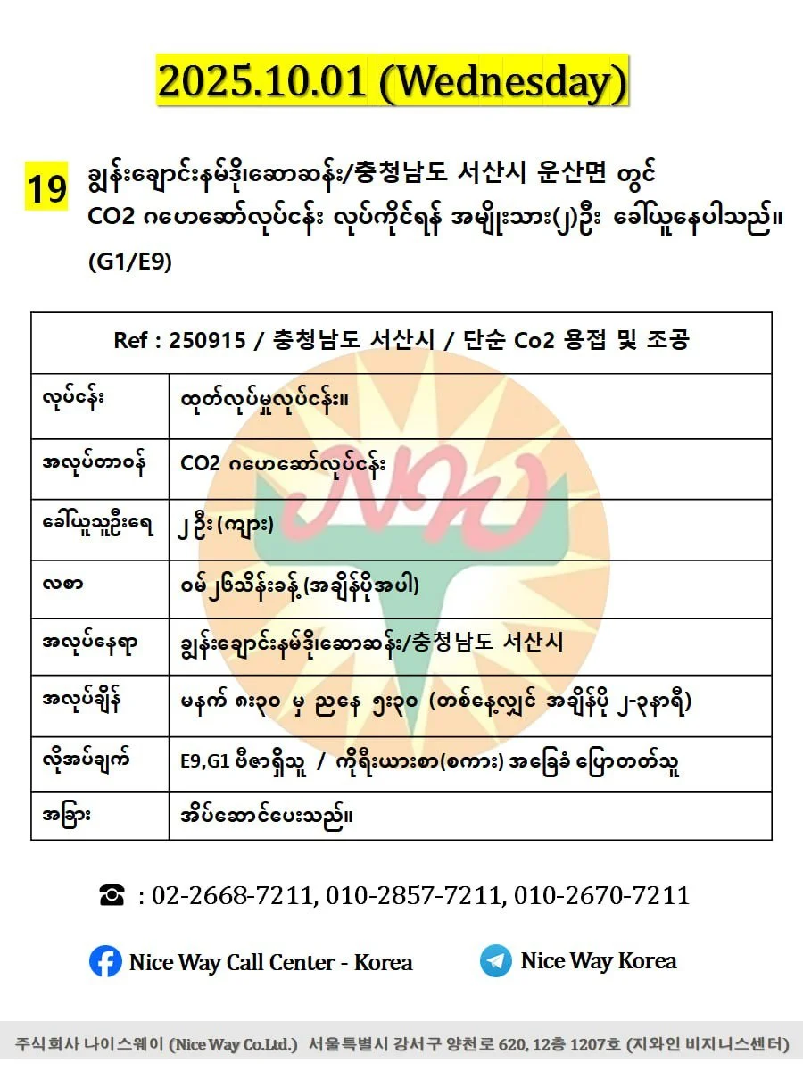 ချွန်းချောင်းနမ်ဒို၊ဆောဆန်း/충청남도 서산시 운산면 တွင်CO2 ဂဟေဆော်လုပ်ငန်း လုပ်ကိုင်ရန် အမျိုးသား(၂)ဦး။(G1/ E9ဗီဇာရှိသူ)။