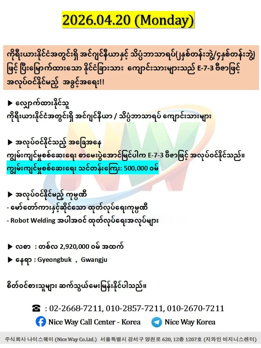 ကိုရီးယားနိုင်ငံတွင်း အင်ဂျင်နီယာနှင့် သိပ္ပံဘွဲ (၂နှစ်ဘွဲ (သို) ၄နှစ်ဘွဲ )ရ နိုင်ငံခြားကျောင်းသားများအတွက် E-7-3 ဗီဇာဖြင့် အလုပ်၀င်နိုင်သော အလုပ်အကိုင် အခွင့် အလမ်း