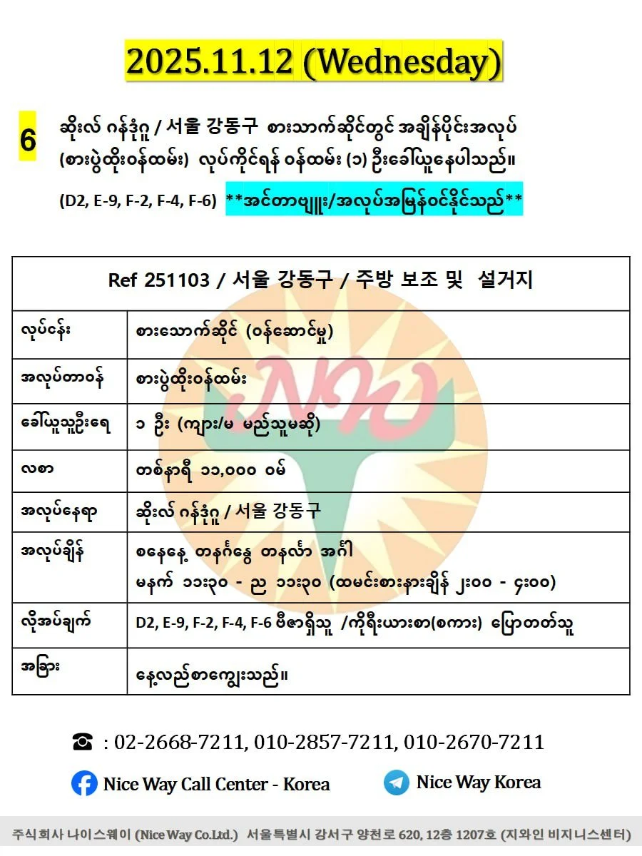 ▶️အရည်အချင်းများ- E-9၊ F-2၊ F-4၊ F-6/ ကိုရီးယားစကား အခြေခံ ပြော