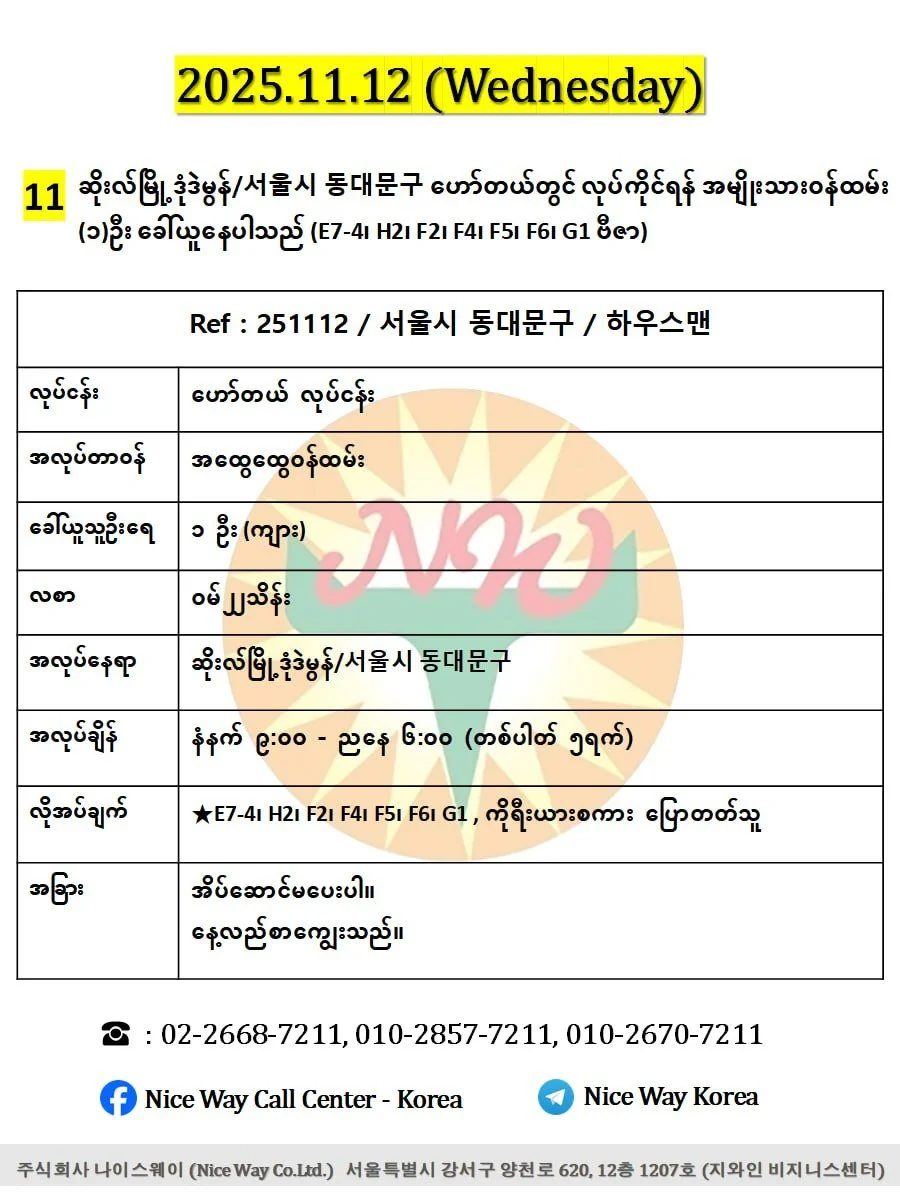 ဆိုးလ်မြို့ ဒုံဒဲမွန်/서울시 동대문구 ဟော်တယ်တွင် လုပ်ကိုင်ရန် အမျိုးသား၀န်ထမ်း (၁)ဦး ခေါ်ယူနေပါသည် (E7-4၊ H2၊ F2၊ F4၊ F5၊ F6၊ G1 ဗီဇာ)