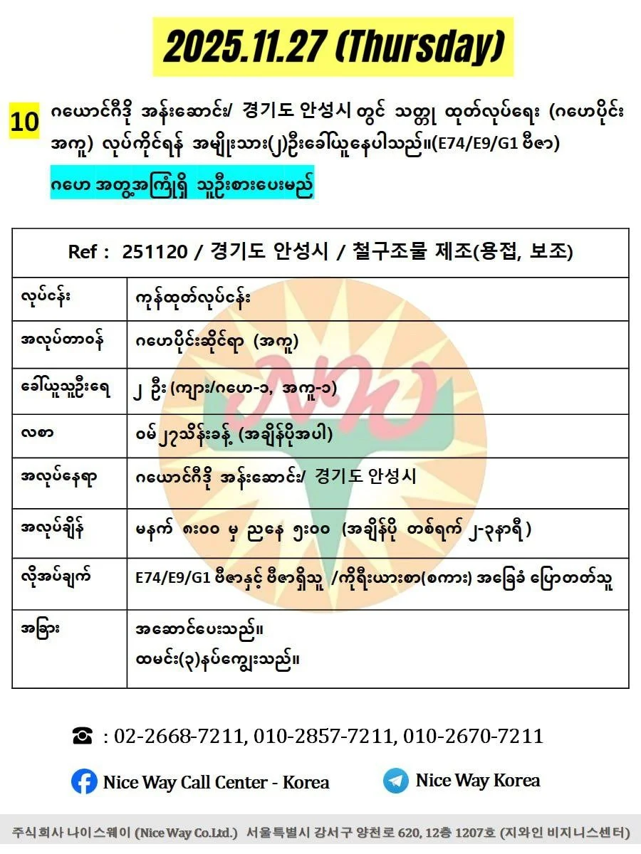 ဂယောင်ဂီဒို အန်းဆောင်း/ 경기도 안성시 တွင် သတ္တု ထုတ်လုပ်ရေး (ဂဟေပိုင်း အကူ) လုပ်ကိုင်ရန် အမျိုးသား(၂)ဦးခေါ်ယူနေပါသည်။(E74/E9/G1 ဗီဇာ)