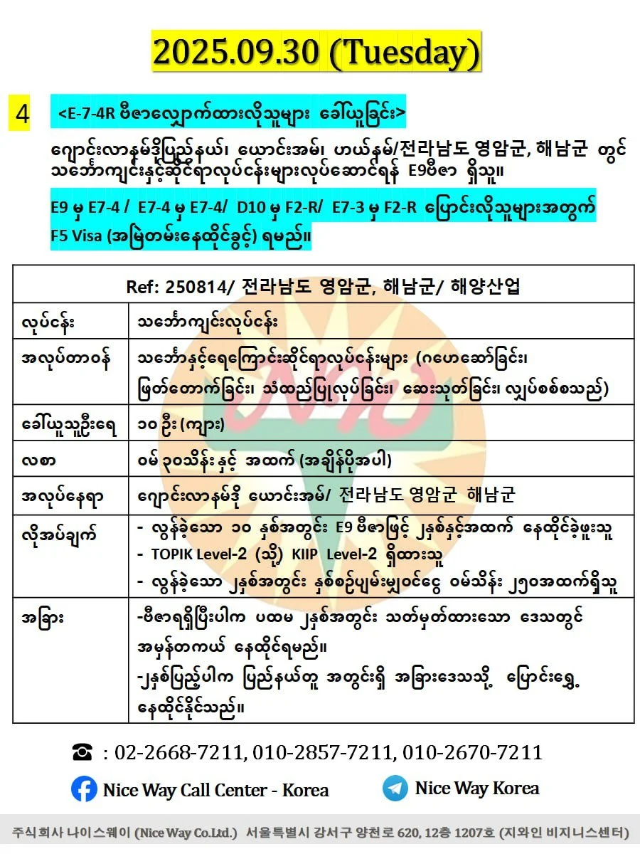 ဂျိုလ်လာနမ်ဒိုပြည်နယ်၊ ယောင်းအမ်၊ဟေနမ်၊ /전라남도 영암군, 해남군 တွင် သင်္ဘောကျင်းနှင့်ဆိုင်ရာလုပ်ငန်းများလုပ်ဆောင်ရန် E9ဗီဇာ ရှိသူ။<E-7-4R ဗီဇာလျှောက်ထားလိုသူများ ခေါ်ယူခြင်း>