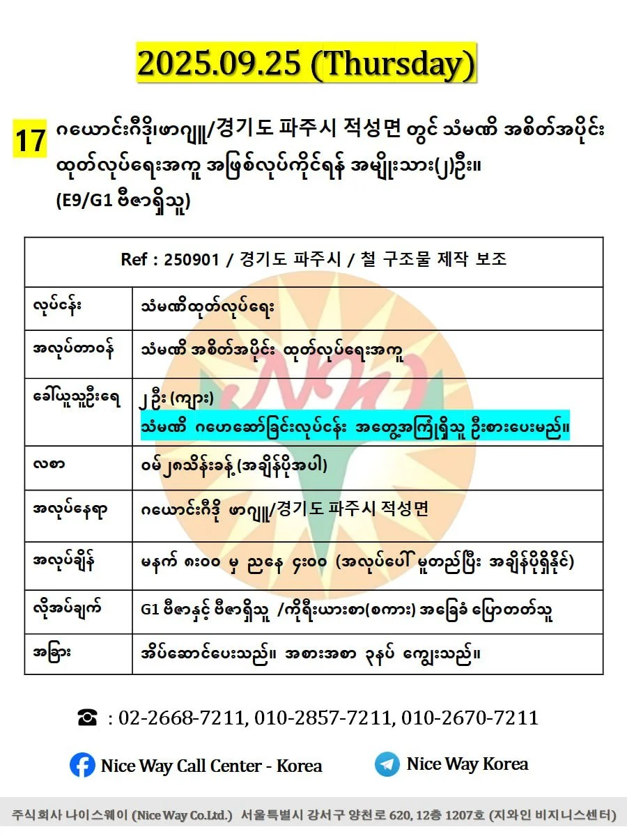 ဂယောင်းဂီဒို၊ဖာဂျူ/경기도 파주시 적성면 တွင် သံမဏိ အစိတ်အပိုင်းများ ထုတ်လုပ်ရေးအကူ အဖြစ်လုပ်ကိုင်ရန် အမျိုးသား(၂)ဦး။(E9/G1 ဗီဇာ)။