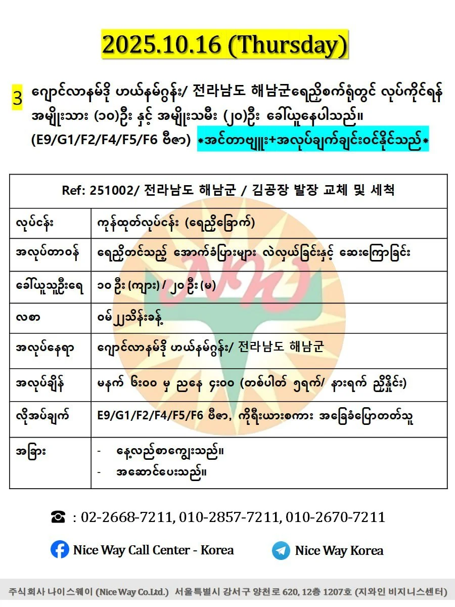 ဂျောင်လာနမ်ဒို ဟယ်နမ်ဂွန်း/ 전라남도 해남군 ရေညှိစက်ရုံတွင် လုပ်ကိုင်ရန် အမျိုးသား (၁၀)ဦး နှင့် အမျိုးသမီး (၂၀)ဦး ခေါ်ယူနေပါသည်။ (E9/G1/F2/F4/F5/F6 ဗီဇာ)