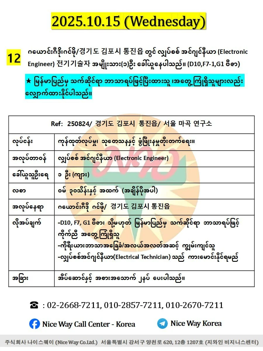 ဂယောင်းဂီဒို၊ဂင်ဖို/경기도 김포시 통진읍 တွင် လျှပ်စစ် အင်ဂျင်နီယာ (Electronic Engineer) 전기기술자 အမျိုးသား(1) ဦး ခေါ်ယူနေပါသည်။