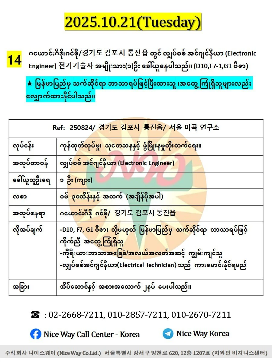 ဂယောင်းဂီဒို၊ဂင်ဖို/경기도 김포시 통진읍 တွင် လျှပ်စစ် အင်ဂျင်နီယာ (Electronic Engineer) 전기기술자 အမျိုးသား(1) ဦး ခေါ်ယူနေပါသည်။