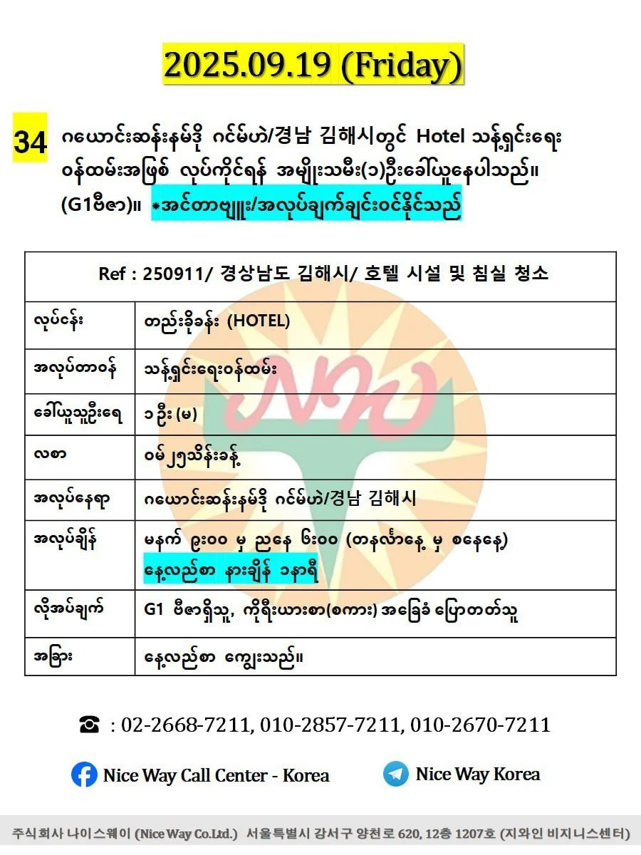 ဂယောင်းဆန်းနမ်ဒို၊ဂင်မ်ဟဲ/경남 김해시 ဟိုတယ်တွင် သန့်ရှင်းရေး ၀န်ထမ်းအဖြစ် လုပ်ကိုင်ရန် အမျိုးသမီး (၁)ဦး။ (G1)