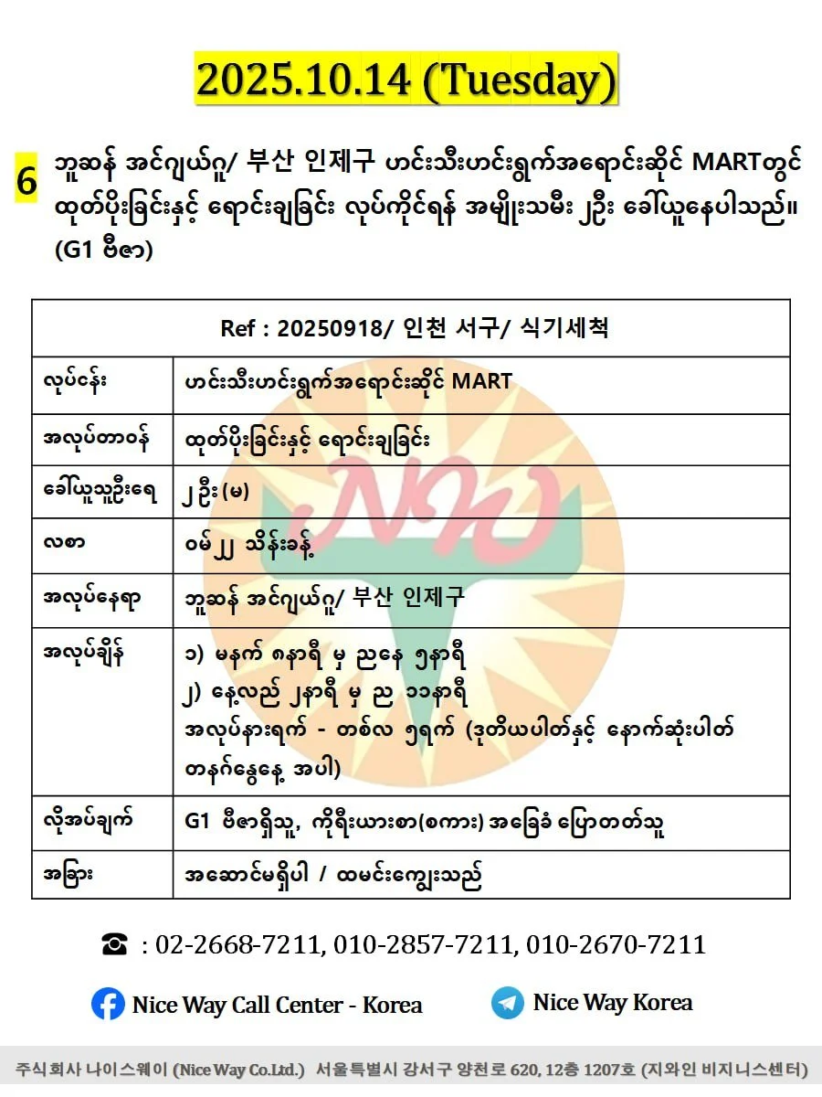ဘူဆန် အင်ဂျယ်ဂူ/ 부산 인제구 ဟင်းသီးဟင်းရွက်အရောင်းဆိုင် MARTတွင် ထုတ်ပိုးခြင်းနှင့် ရောင်းချခြင်း လုပ်ကိုင်ရန် အမျိုးသမီး ၂ဦး ခေါ်ယူနေပါသည်။ (G1 ဗီဇာနှင့် ဗီဇာရှိသူ)