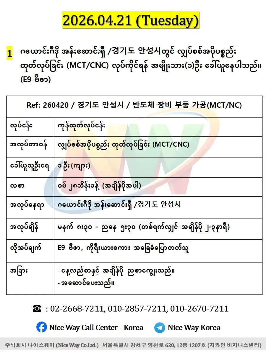 ဂယောင်းဂီဒို အန်းဆောင်းရှီ /경기도 안성시 / လျှပ်စစ် အပို ပစ္စည်းထုတ်လုပ်ခြင်း (MCT/CNC) လုပ်ကိုင်ရန် အမျိုးသား(၁)ဦးခေါ်ယူနေပါသည်။(E9 ဗီဇာ)