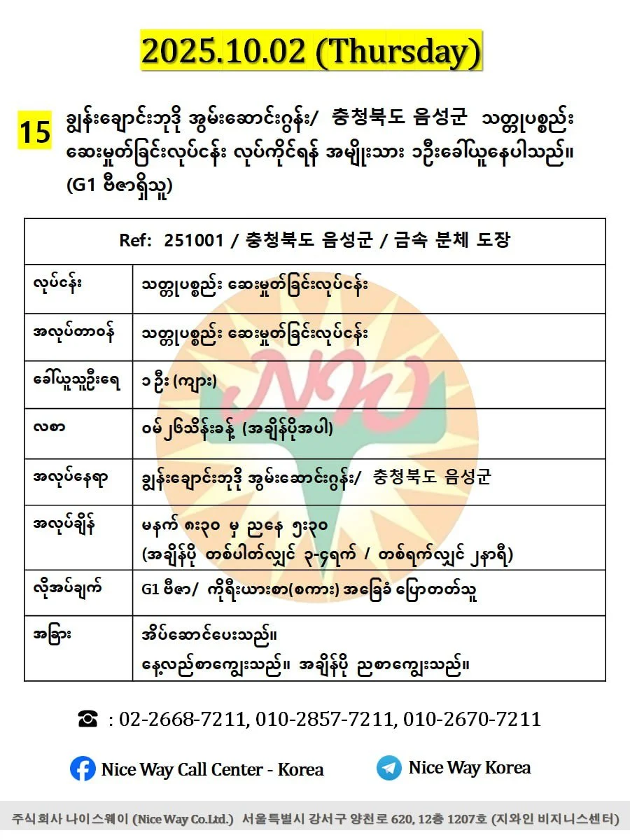 ချွန်းချောင်းဘုဒို အွမ်းဆောင်းဂွန်း/ 충청북도 음성군 သတ္တုပစ္စည်း ဆေးမှုတ်ခြင်းလုပ်ငန်း လုပ်ကိုင်ရန် အမျိုးသား ၁ဦး။ (G1 ဗီဇာ)