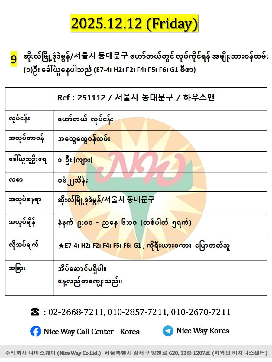 ဆိုးလ်မြို့ ဒုံဒဲမွန်/서울시 동대문구 ဟော်တယ်တွင် လုပ်ကိုင်ရန် အမျိုးသား၀န်ထမ်း (၁)ဦး ခေါ်ယူနေပါသည် (E7-4၊ H2၊ F2၊ F4၊ F5၊ F6၊ G1 ဗီဇာ)