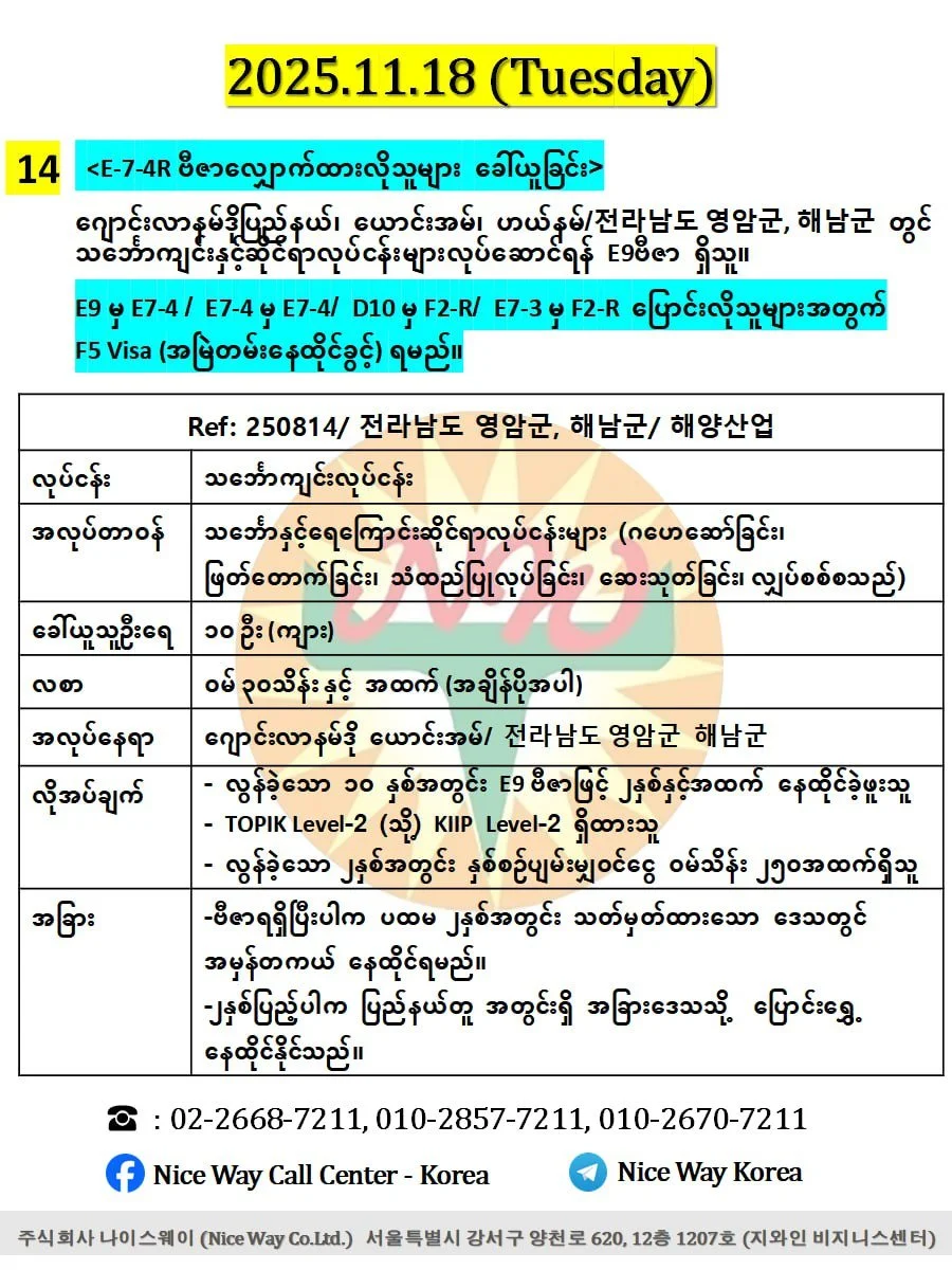 ဂျိုလ်လာနမ်ဒိုပြည်နယ်၊ ယောင်းအမ်၊ဟေနမ်၊ /전라남도 영암군, 해남군 တွင် သင်္ဘောကျင်းနှင့်ဆိုင်ရာလုပ်ငန်းများလုပ်ဆောင်ရန် E9ဗီဇာ ရှိသူ။<E-7-4R ဗီဇာလျှောက်ထားလိုသူများ ခေါ်ယူခြင်း>