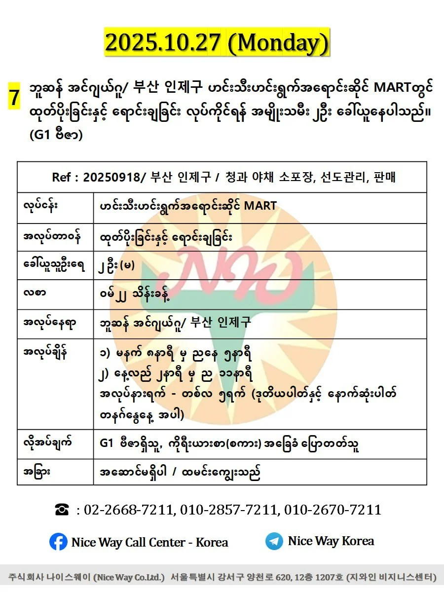 ဘူဆန် အင်ဂျယ်ဂူ/ 부산 인제구 ဟင်းသီးဟင်းရွက်အရောင်းဆိုင် MARTတွင် ထုတ်ပိုးခြင်းနှင့် ရောင်းချခြင်း လုပ်ကိုင်ရန် အမျိုးသမီး ၂ဦး ခေါ်ယူနေပါသည်။ (G1 ဗီဇာနှင့် ဗီဇာရှိသူ)