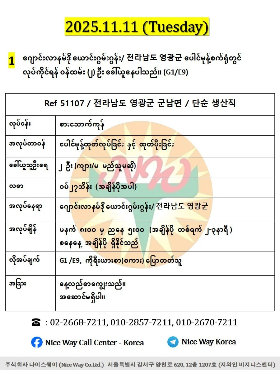 ▶️ အလုပ်တည်နေရာ- ဂျောင်းလာနမ်ဒို ယောင်းဂွမ်းဂွန်း/ 전라남도 영광군