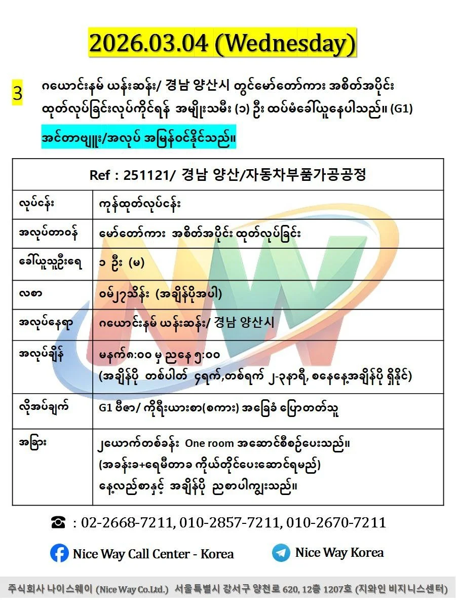 ဂယောင်းနမ် ယန်းဆန်း/ 경남 양산시 တွင်မော်တော်ကား အစိတ်အပိုင်း ထုတ်လုပ်ခြင်းလုပ်ငန်းအတွက် အမျိုးသမီး (၁) ဦး ထပ်မံခေါ်ယူနေပါသည်။ (G1)