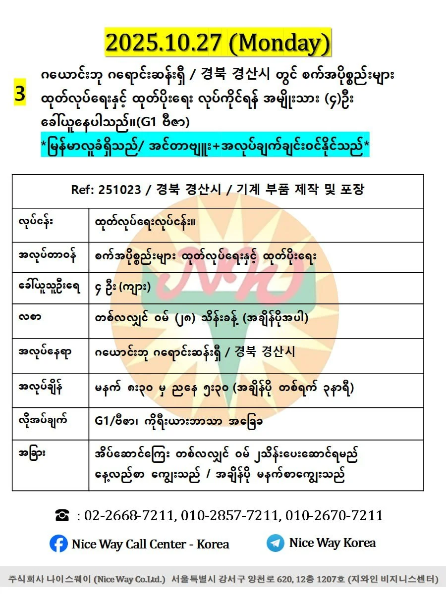 ဂယောင်းဘု ဂရောင်းဆန်းရှီ / 경북 경산시 တွင် စက်အပိုစ္စည်းများ ထုတ်လုပ်ရေးနှင့် ထုတ်ပိုးရေး လုပ်ကိုင်ရန် အမျိုးသား (၄)ဦး ခေါ်ယူနေပါသည်။(G1 ဗီဇာ) *မြန်မာလူခံရှိသည်/ အင်တာဗျူး+အလုပ်ချက်ချင်း၀င်နိုင်သည်*