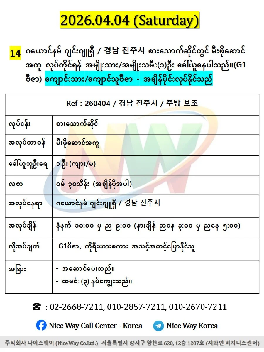 ဂယောင်နမ် ဂျင်းဂျူရှီ / 경남 진주시 စားသောက်ဆိုင်တွင် မီးဖိုဆောင် အကူ လုပ်ကိုင်ရန် အမျိုးသား/အမျိုးသမီး(၁)ဦး ခေါ်ယူနေပါသည်။(G1 ဗီဇာ)