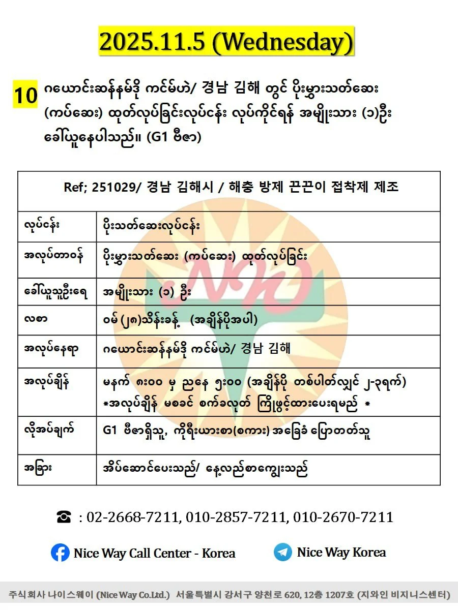 ဂယောင်းဆန်နမ်ဒို ကင်မ်ဟဲ/ 경남 김해 တွင် ပိုးမွှားသတ်ဆေး (ကပ်ဆေး) ထုတ်လုပ်ခြင်းလုပ်ငန်း လုပ်ကိုင်ရန် အမျိုးသား (၁)ဦး ခေါ်ယူနေပါသည်။ (G1 ဗီဇာ)