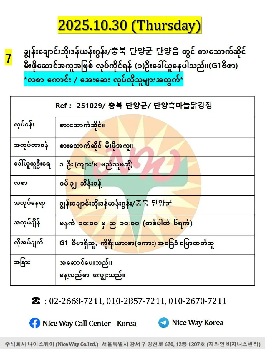 ချွန်းချောင်းဘို၊ဒန်ယန်းဂွန်း/충북 단양군 단양읍 တွင် စားသောက်ဆိုင် မီးဖိုဆောင်အကူအဖြစ် လုပ်ကိုင်ရန် (၁)ဦးခေါ်ယူနေပါသည်။(G1ဗီဇာနှင့် ဗီဇာရှိသူ)။