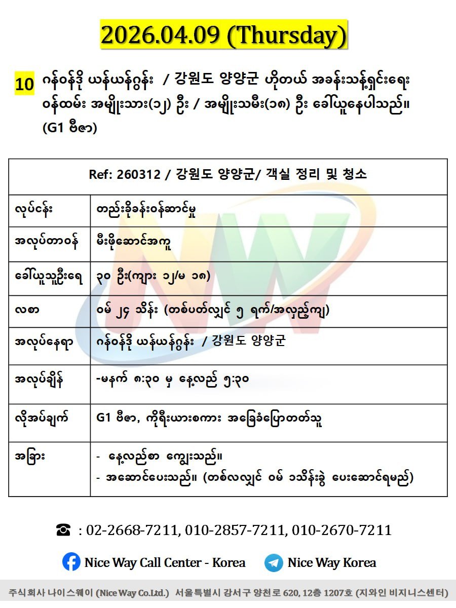 ဂန်ဝန်ဒို ယန်ယန်ဂွန်း / 강원도 양양군ဟိုတယ် အခန်းသန့်ရှင်းရေးဝန်ထမ်းလုပ်ကိုင်ရန်အမျိုးသား(၁၂) ဦး / အမျိုးသမီး(၁၈) ဦး ခေါ်ယူနေပါသည်။(G1 ဗီဇာ)