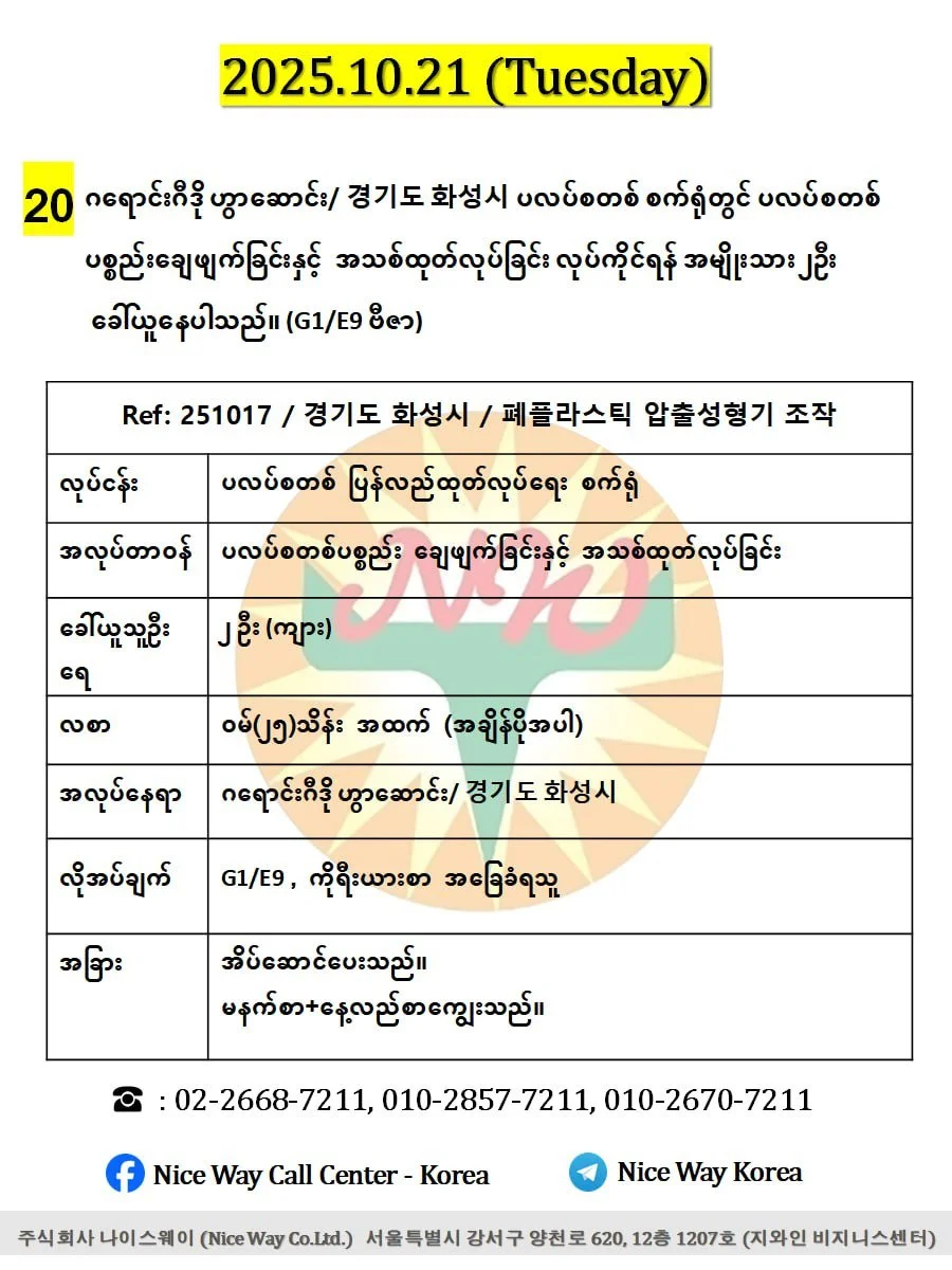 ဂရောင်းဂီဒို ဟွာဆောင်း/ 경기도 화성시 ပလပ်စတစ် စက်ရုံတွင် ပလပ်စတစ် ပစ္စည်းချေဖျက်ခြင်းနှင့် အသစ်ထုတ်လုပ်ခြင်း လုပ်ကိုင်ရန် အမျိုးသား ၂ဦး ခေါ်ယူနေပါသည်။ (G1/E9 ဗီဇာ)