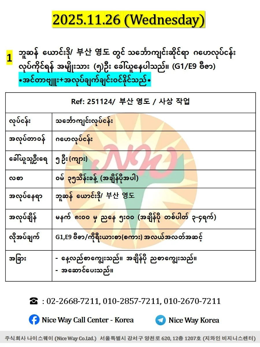 ဘူဆန် ယောင်းဒို/ 부산 영도 တွင် သင်္ဘောကျင်းဆိုင်ရာ ဂဟေလုပ်ငန်း လုပ်ကိုင်ရန် အမျိုးသား (၅)ဦး ခေါ်ယူနေပါသည်။ (G1 ဗီဇာ)