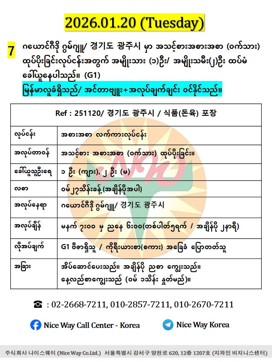 ဂယောင်ဂီဒို ဂွမ်ဂျူ/ 경기도 광주시 မှာ အသင့်စားအစားအစာ (ဝက်သား) ထုပ်ပိုးခြင်းလုပ်ငန်းအတွက် အမျိုးသား (၁)ဦး / အမျိုးသမီး (၂)ဦး ထပ်မံ ခေါ်ယူနေပါသည်။ (G1))