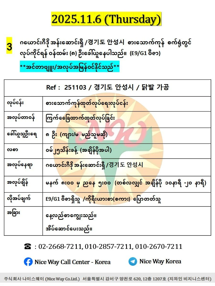ဂယောင်းဂီဒို အန်းဆောင်းရှီ /경기도 안성시 စားသောက်ကုန်စက်ရုံတွင် လုပ်ကိုင်ရန် ၀န်ထမ်း (၈) ဦးခေါ်ယူနေပါသည်။(E9/G1 ဗီဇာ)