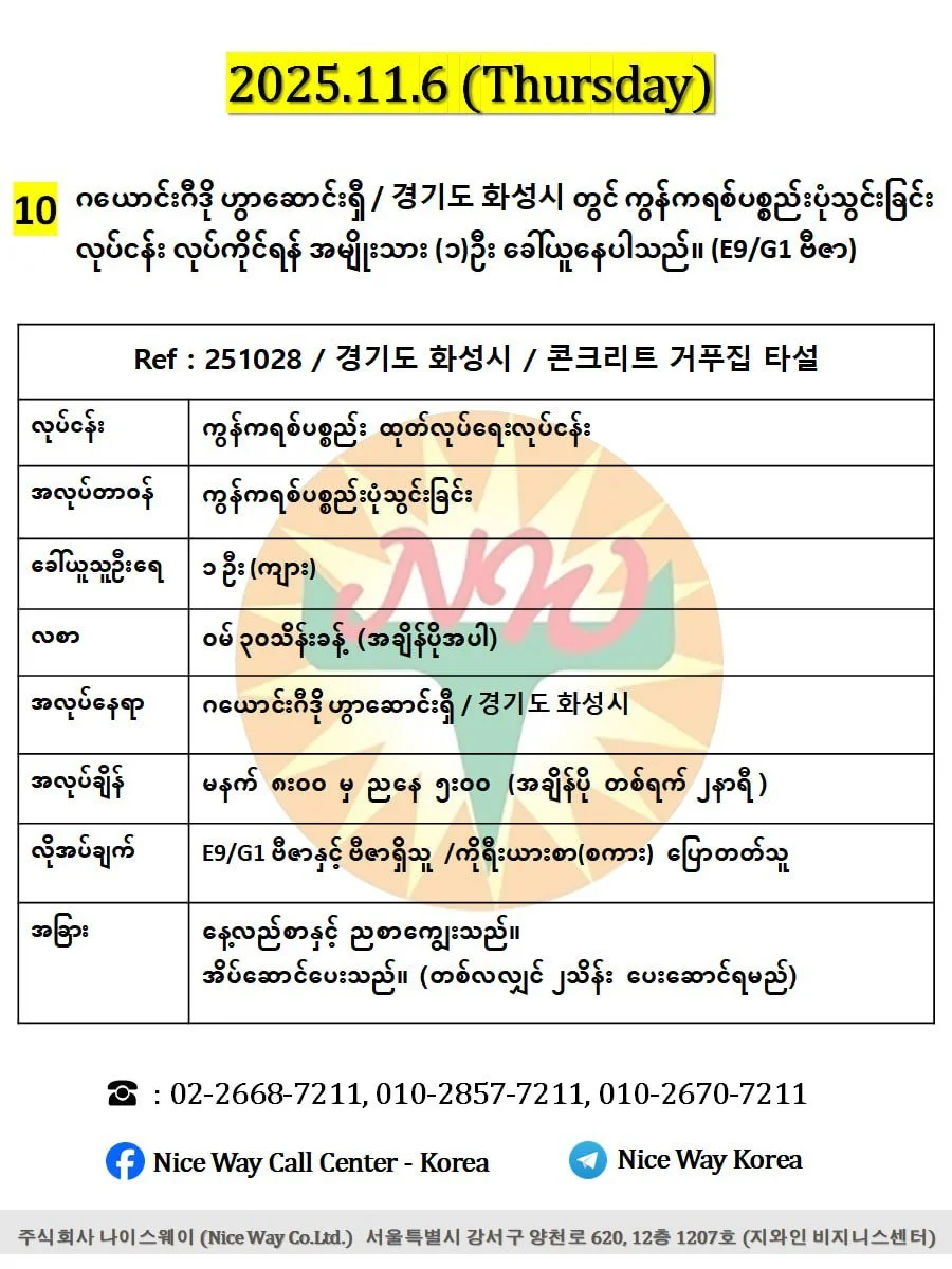 ဂယောင်းဂီဒို ဟွာဆောင်းရှီ / 경기도 화성시 တွင် ကွန်ကရစ်ပစ္စည်းပုံသွင်းခြင်းလုပ်ငန်း လုပ်ကိုင်ရန် အမျိုးသား (၁)ဦး ခေါ်ယူနေပါသည်။ (E9/G1 ဗီဇာ)