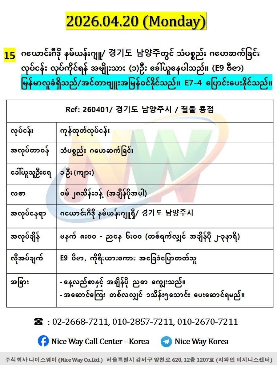 ဂယောင်ဂီဒို နမ်ယန်းဂျူရှီ/ 경기도 남양주시တွင် သံပစ္စည်း ဂဟေဆက်ခြင်းလုပ်ငန်း လုပ်ကိုင်ရန် အမျိုးသား (၁)ဦး ခေါ်ယူနေပါသည်။ (E9 ဗီဇာ)