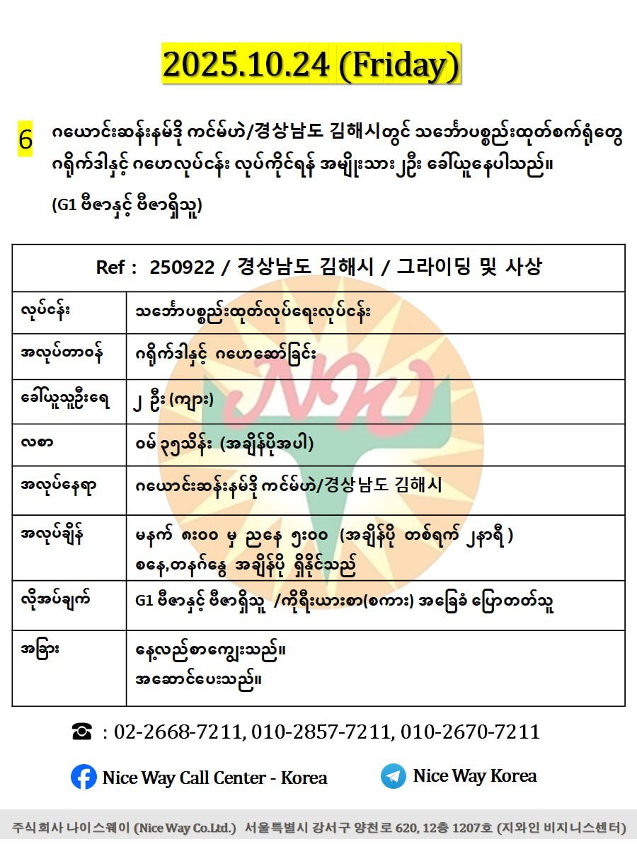 ▶️ အလုပ်ချိန် 8:00AM - 5:00PM၊ (အချိန်ပို တစ်ရက်လျှင် ၂နာရီ)