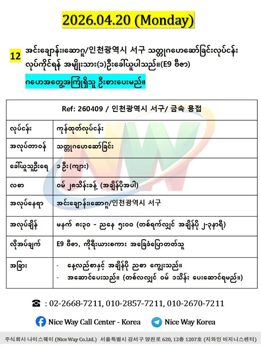 ▶️ အလုပ်တည်ေနရာ- အင်းေချာန်း၊ဆောဂူ/인천광역시 서구