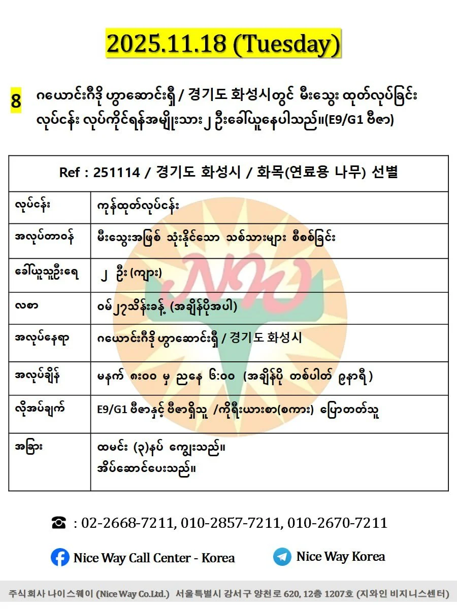 ဂယောင်းဂီဒို ဟွာေဆာင်ရှီ / 경기도 화성시တွင် မီးသွေး ထုတ်လုပ်ခြင်း လုပ်ငန်း လုပ်ကိုင်ရန်အမျိုးသား ၂ ဦးခေါ်ယူနေပါသည်။(E9/G1 ဗီဇာ)