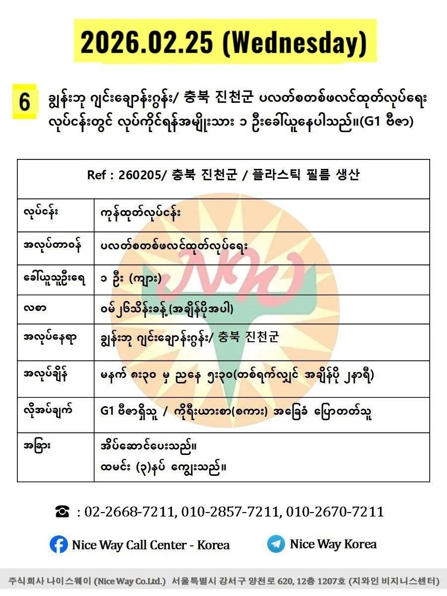 ချွန်းဘု ဂျင်း ချောန်းဂွန်း/ 충북 진천군 ပလတ်စတစ်ဖလင်ထုတ်လုပ်ရေး လုပ်ငန်းတွင် လုပ်ကိုင်ရန်အမျိုးသား ၁ ဦးခေါ်ယူနေပါသည်။