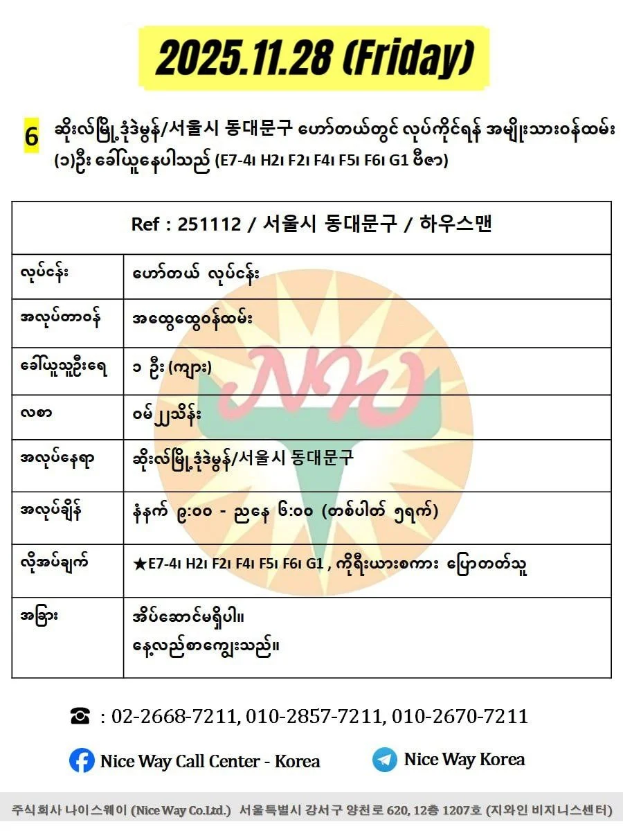 ဆိုးလ်မြို ဒုံဒဲမွန်/서울시 동대문구 ဟော်တယ်တွင် လုပ်ကိုင်ရန် အမျိုးသား၀န်ထမ်း (၁)ဦး ခေါ်ယူနေပါသည် (E7-4၊ H2၊ F2၊ F4၊ F5၊ F6၊ G1 ဗီဇာ)