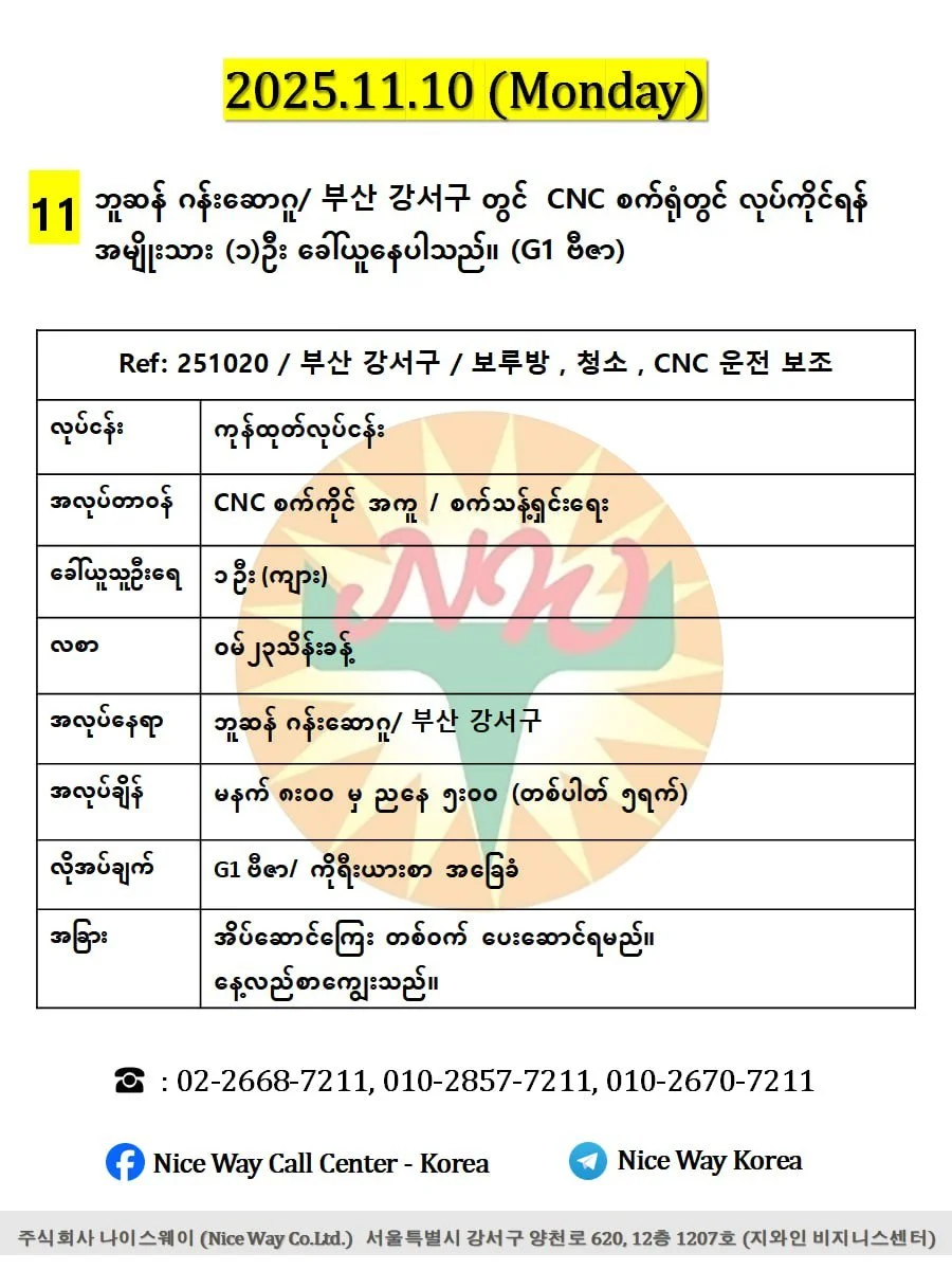 ဘူဆန် ဂန်းဆောဂူ/ 부산 강서구 တွင် CNC စက်ရုံတွင် လုပ်ကိုင်ရန် အမျိုးသား (၁)ဦး ခေါ်ယူနေပါသည်။ (G1 ဗီဇာနှင့် ဗီဇာရှိသူ)