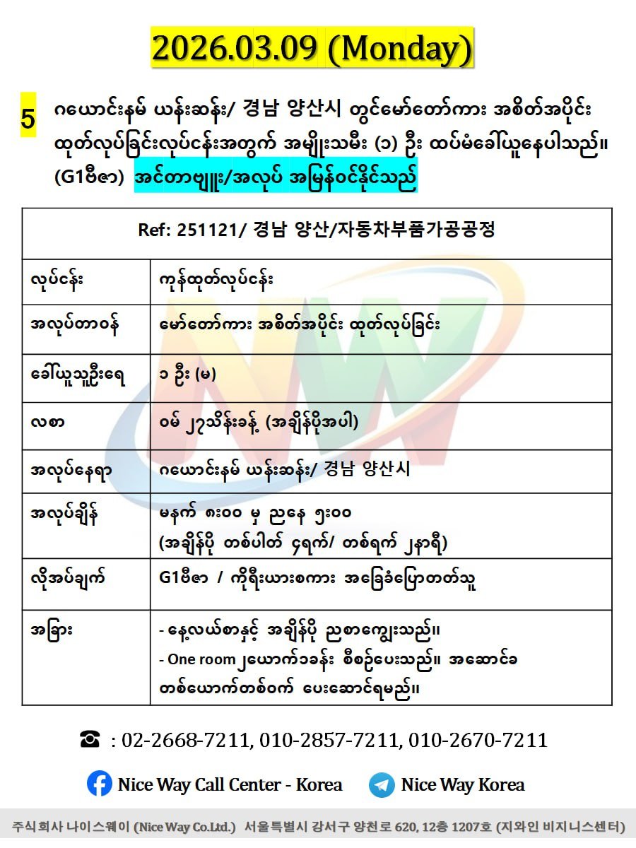 ဂယောင်းနမ် ယန်းဆန်း/ 경남 양산시 တွင်မော်တော်ကား အစိတ်အပိုင်း ထုတ်လုပ်ခြင်းလုပ်ငန်းအတွက် အမျိုးသမီး (၁) ဦး ထပ်မံခေါ်ယူနေပါသည်။ (G1)