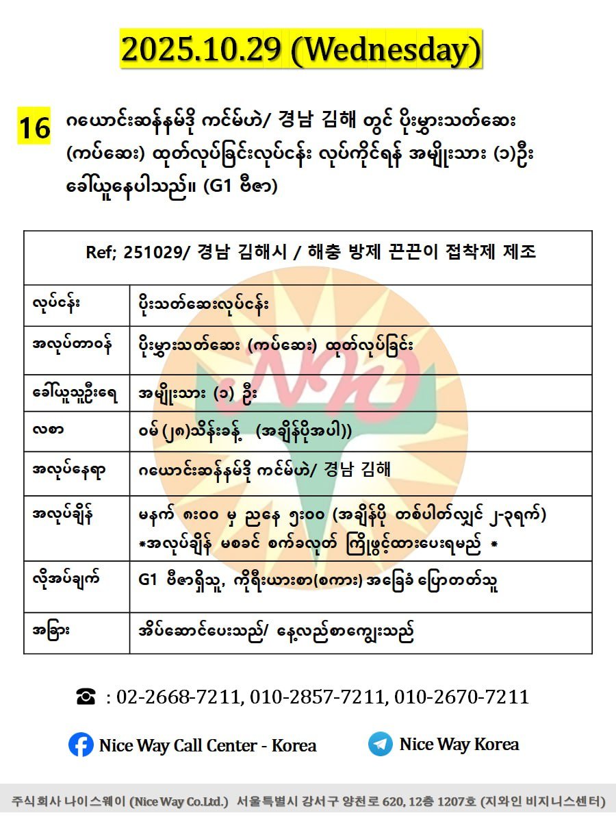 ဂယောင်းဆန်နမ်ဒို ကင်မ်ဟဲ/ 경남 김해 တွင် ပိုးမွှားသတ်ဆေး (ကပ်ဆေး) ထုတ်လုပ်ခြင်းလုပ်ငန်း လုပ်ကိုင်ရန် အမျိုးသား (၁)ဦး ခေါ်ယူနေပါသည်။ (G1 ဗီဇာ)