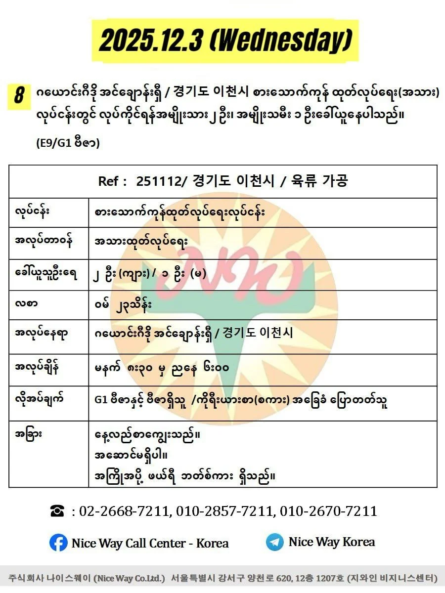 ဂယောင်းဂီဒို အင်ချောန်းရှီ / 경기도 이천시 စားသောက်ကုန် ထုတ်လုပ်ရေး(အသား)လုပ်ငန်းတွင် လုပ်ကိုင်ရန်အမျိုးသား ၂ ဦး၊ အမျိုးသမီး ၁ ဦးခေါ်ယူနေပါသည်။(E9/G1 ဗီဇာ)