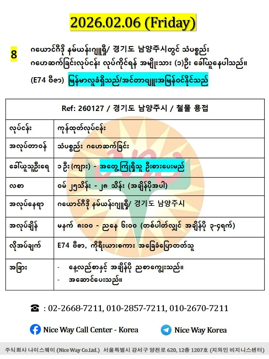 ဂယောင်ဂီဒို နမ်ယန်းဂျူရှီ/ 경기도 남양주시တွင် သံပစ္စည်း ဂဟေဆက်ခြင်းလုပ်ငန်း လုပ်ကိုင်ရန် အမျိုးသား (၁)ဦး ခေါ်ယူနေပါသည်။(E74 ဗီဇာ)