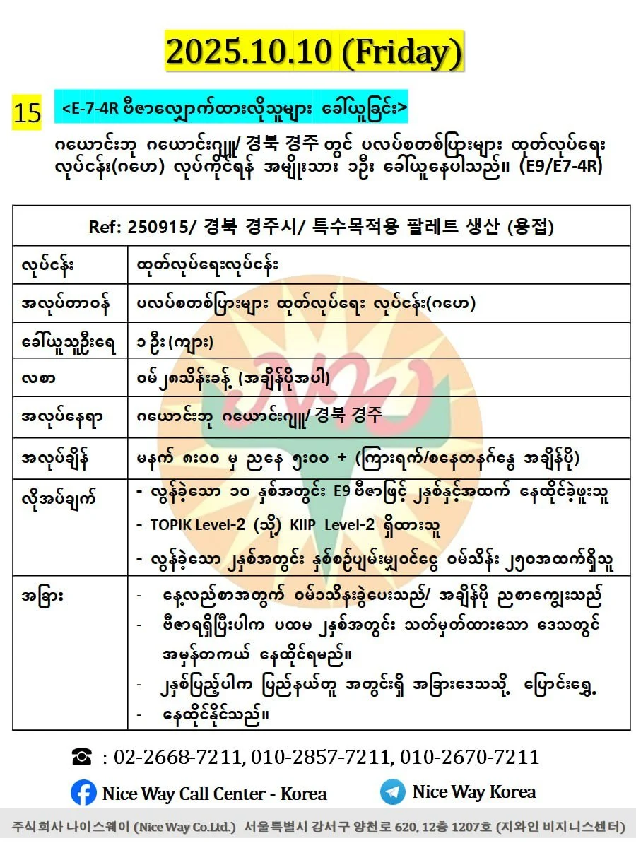 E-7-4R လျှောက်ထားသူလိုသူများအတွက် ဂယောင်းဘို၊ဂယောင်းဂျူ/경북 경주 တွင် အခင်းပြားများ(Pallet) ထုတ်လုပ်ခြင်း(ဂဟေ)လုပ်ကိုင်ရန် အမျိုးသား(၁)ဦး။ (E9/E7-4R)