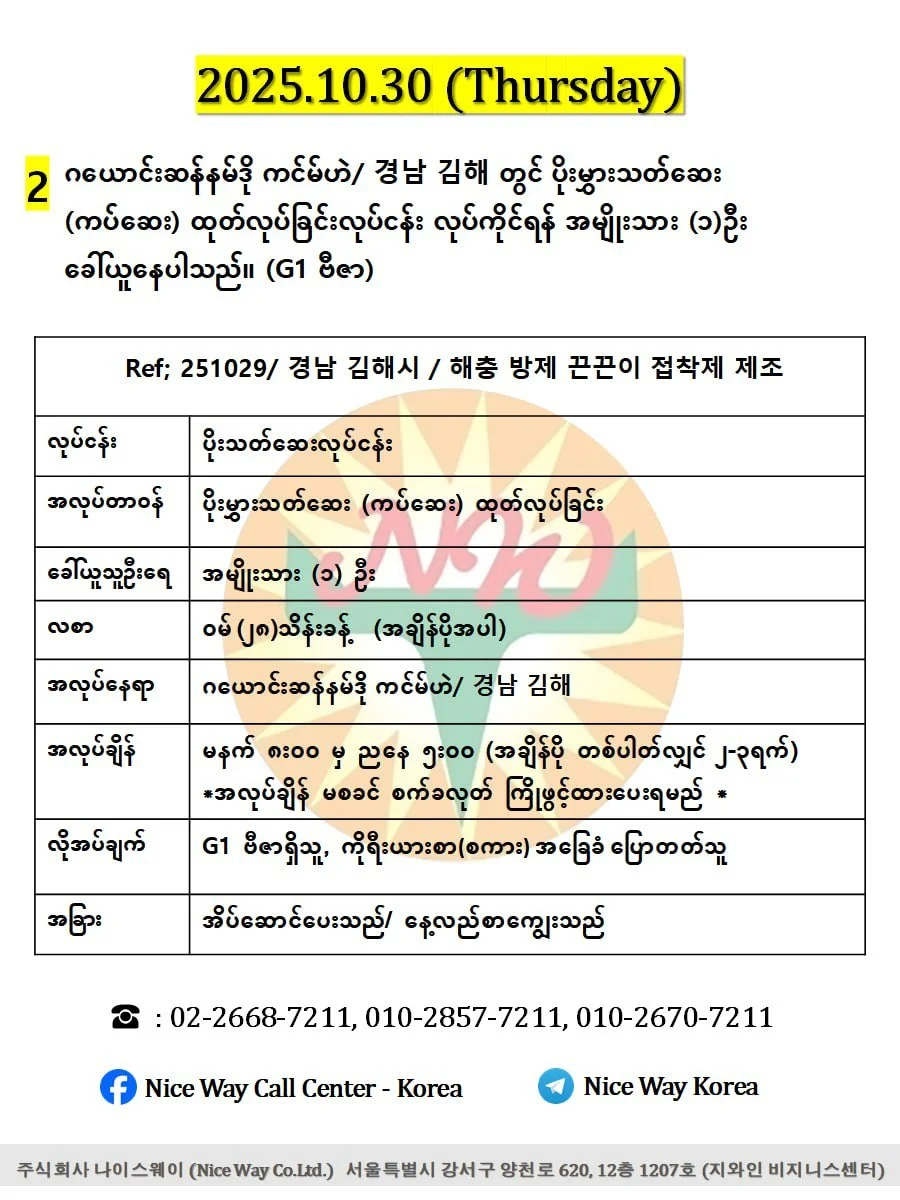 ဂယောင်းဆန်နမ်ဒို ကင်မ်ဟဲ/ 경남 김해 တွင် ပိုးမွှားသတ်ဆေး (ကပ်ဆေး) ထုတ်လုပ်ခြင်းလုပ်ငန်း လုပ်ကိုင်ရန် အမျိုးသား (၁)ဦး ခေါ်ယူနေပါသည်။ (G1 ဗီဇာ)