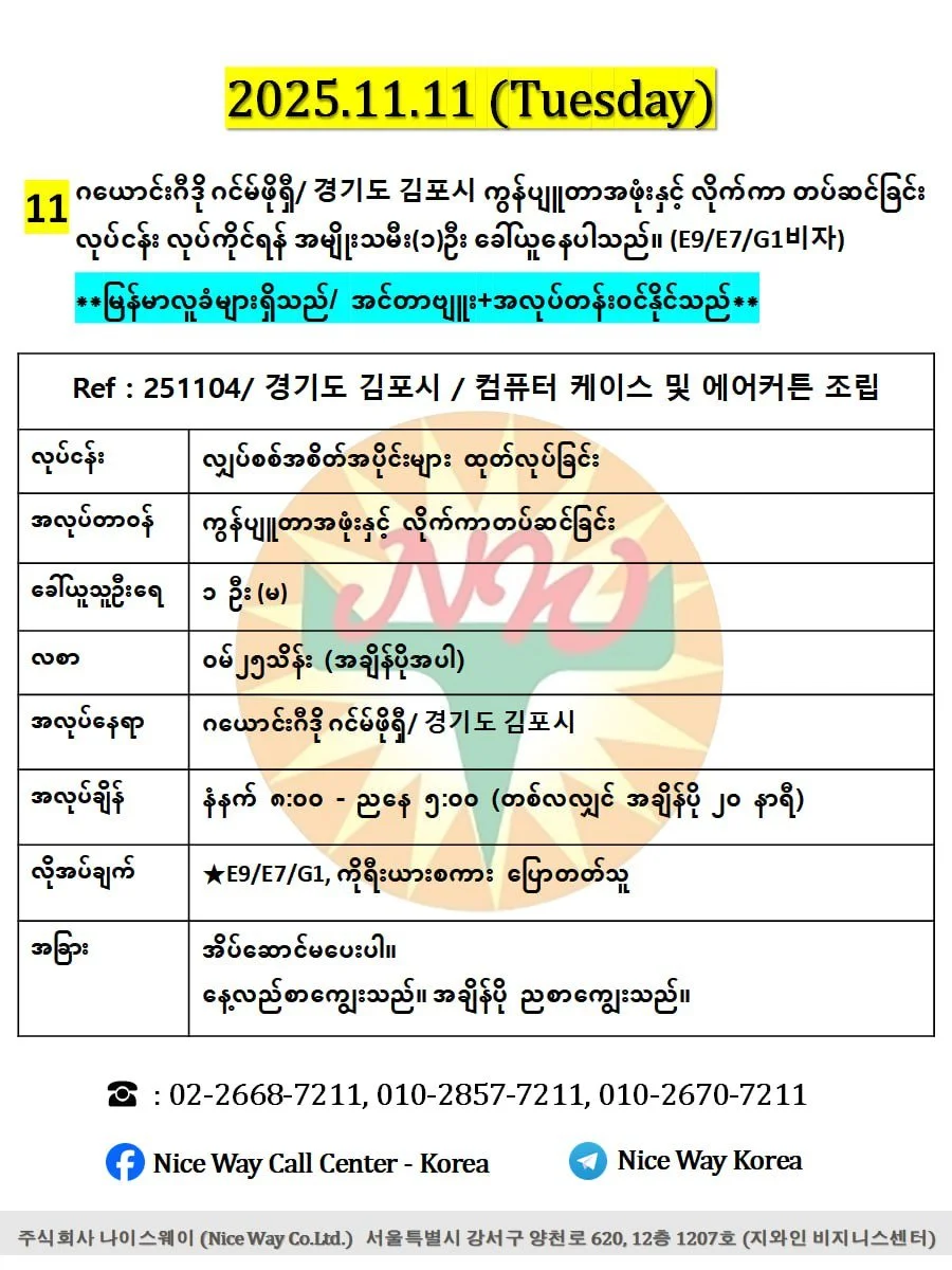 ဂယောင်းဂီဒို ဂင်မ်ဖိုရှီ/ 경기도 김포시 ကွန်ပျူတာအဖုံးနှင့် လိုက်ကာ တပ်ဆင်ခြင်း လုပ်ငန်း လုပ်ကိုင်ရန် အမျိုးသမီး(၁)ဦး ခေါ်ယူနေပါသည်။(E9/E7/G1비자)