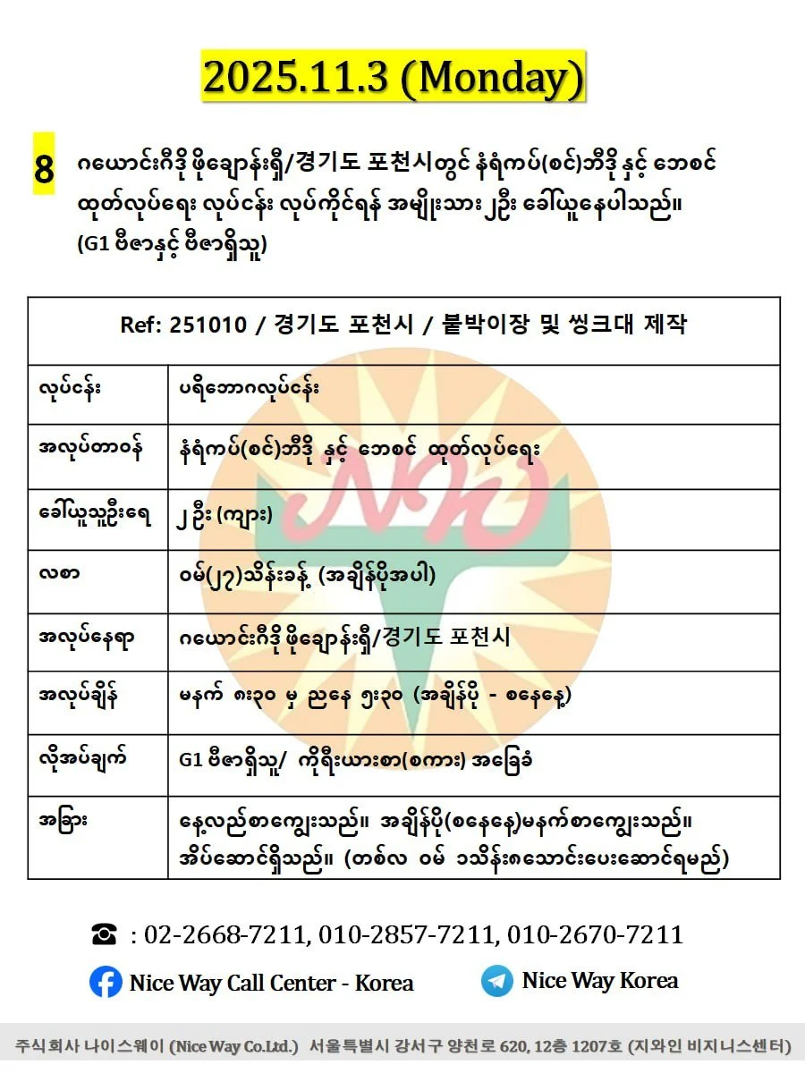 ဂယောင်းဂီဒို ဖိုချောန်းရှီ/경기도 포천시တွင် နံရံကပ်(စင်)ဘီဒို နှင့် ဘေစင် ထုတ်လုပ်ရေး လုပ်ငန်း လုပ်ကိုင်ရန် အမျိုးသား ၂ဦး ခေါ်ယူနေပါသည်။ (G1 ဗီဇာနှင့် ဗီဇာရှိသူ)