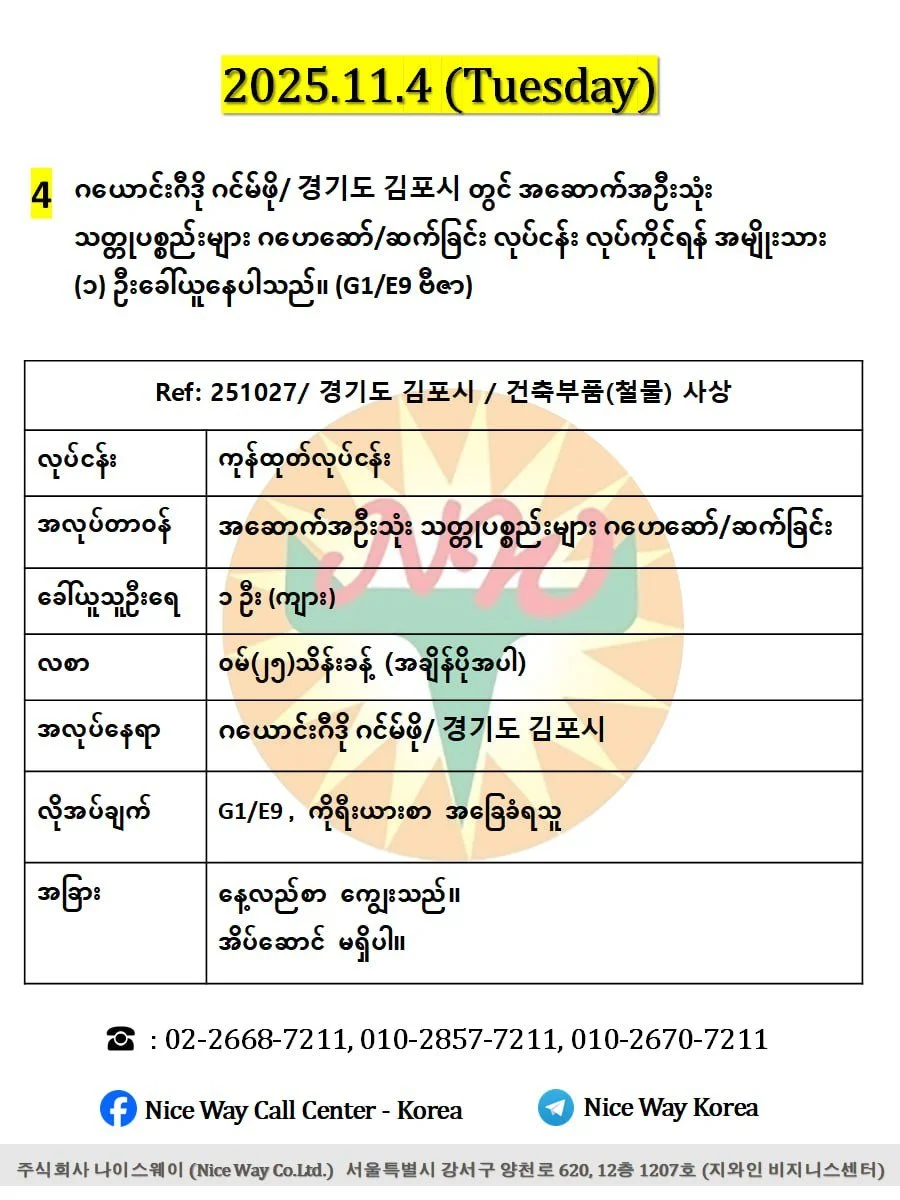 ဂယောင်းဂီဒို ဂင်မ်ဖို/ 경기도 김포시 တွင် အဆောက်အဦးသုံး သတ္တုပစ္စည်းများ ဂဟေဆော်/ဆက်ခြင်း လုပ်ငန်း လုပ်ကိုင်ရန်အမျိုးသား (၁) ဦးခေါ်ယူနေပါသည်။(G1/E9 ဗီဇာ)
