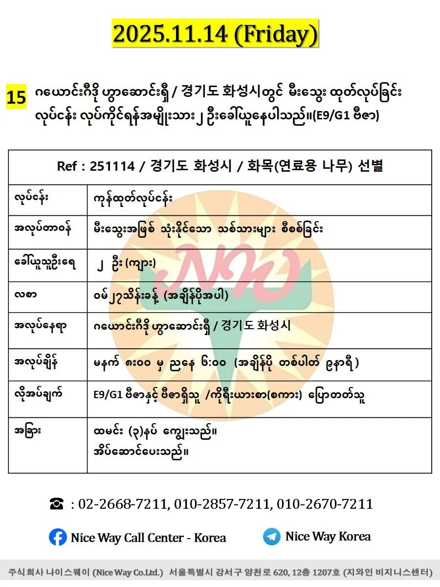 ဂယောင်းဂီဒို ဟွာေဆာင်ရှီ / 경기도 화성시တွင် မီးသွေး ထုတ်လုပ်ခြင်း လုပ်ငန်း လုပ်ကိုင်ရန်အမျိုးသား ၂ ဦးခေါ်ယူနေပါသည်။(E9/G1 ဗီဇာ)