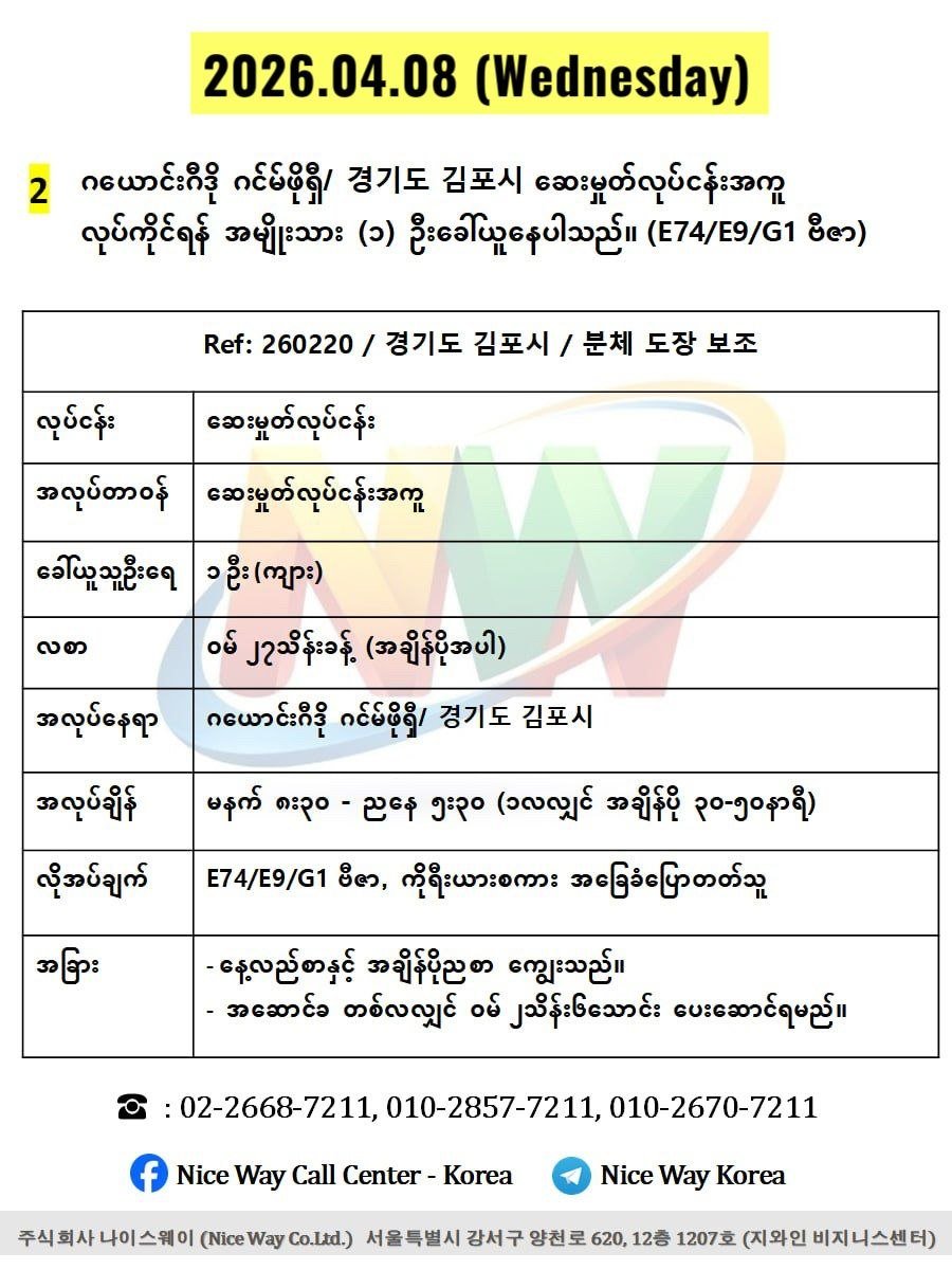 ဂယောင်ဂီဒို ဂင်မ်ဖိုရှီ/ 경기도 김포시 ဆေးမှုတ်လုပ်ငန်းအကူလုပ်ကိုင်ရန် အမျိုးသား ၁ ဦးခေါ်ယူနေပါသည်။(E74/E9/G1 ဗီဇာ)
