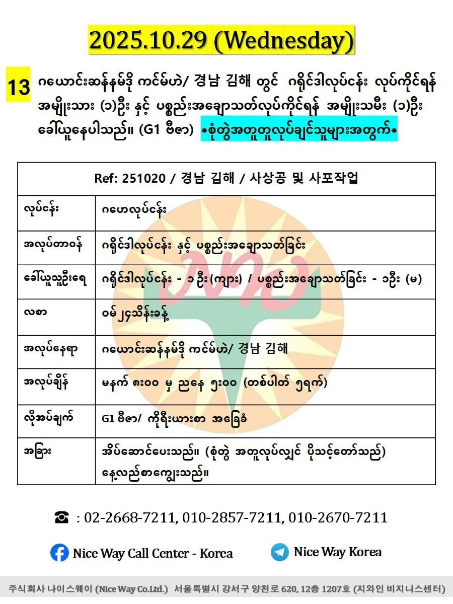 ဂယောင်းဆန်နမ်ဒို ကင်မ်ဟဲ/ 경남 김해 တွင် ဂရိုင်ဒါပိုင်းဆိုင်ရာ လုပ်ကိုင်ရန် အမျိုးသား (၁)ဦး နှင့် ပစ္စည်းအချောသတ်လုပ်ကိုင်ရန် အမျိုးသမီး (၁)ဦး ခေါ်ယူနေပါသည်။ (G1 ဗီဇာ)